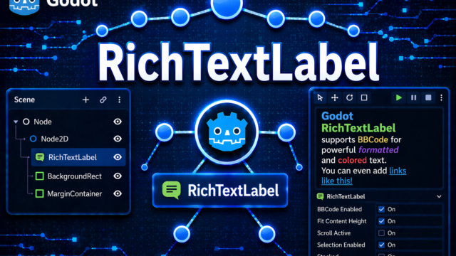 はじめに前回解説したLabelノードで基本的なテキスト表示ができますが、ゲーム開発では「ストーリーの会話文に人物の名前を赤で、セリフを白で表示したい」「アイテム説明に重要な部分を太字にしたい」など、同じテキストの中に異なる色や装飾を混在させ...