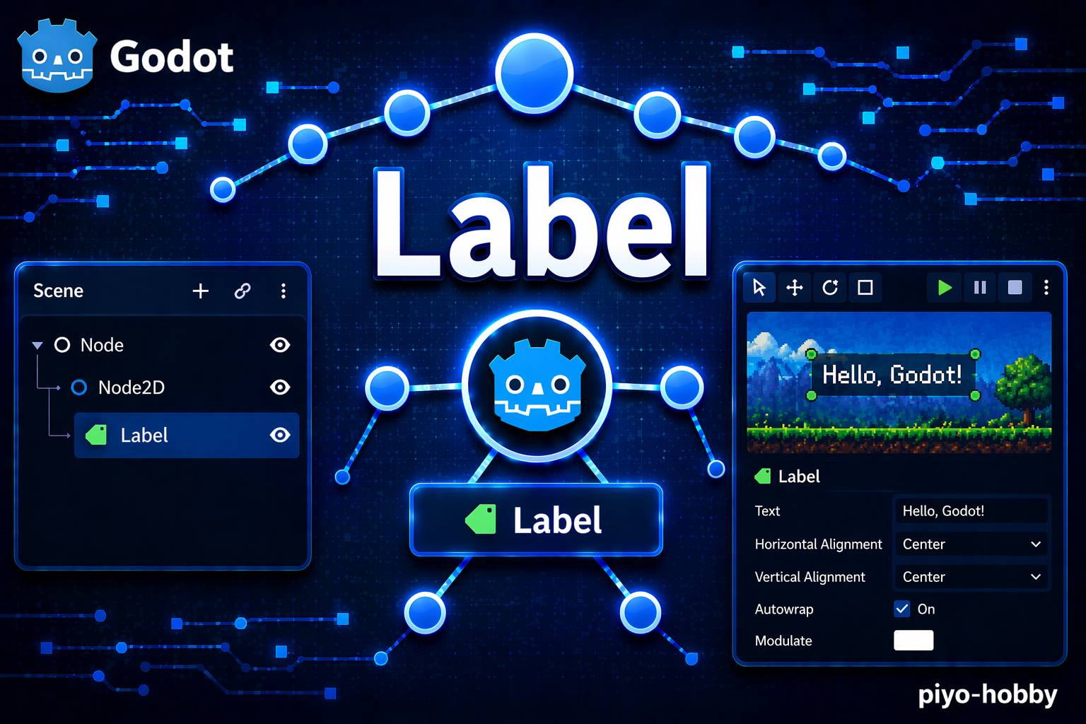 Labelノードは、ゲーム画面上にテキスト(文字列)を表示するノードです。スコア、HPゲージの数字、会話ウィンドウ、ボタンのラベルなど、文字を出す場面ではほぼ必ず登場します。